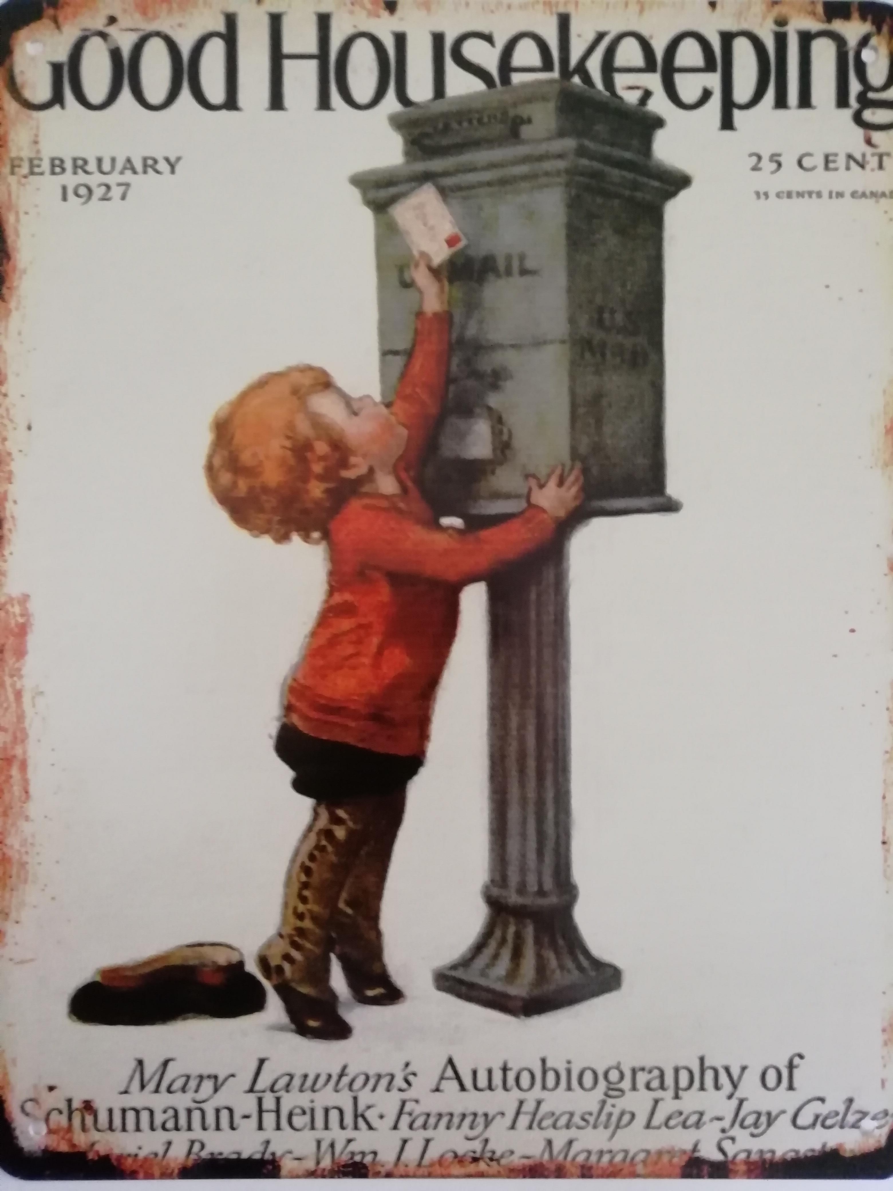 Metalen wandbord met de tekst Goodhousekeeping met een jongen bij een brievenbusTekst Mary Lawton's autobiography of Schumann HeinkAfmeting : 20x25 cm